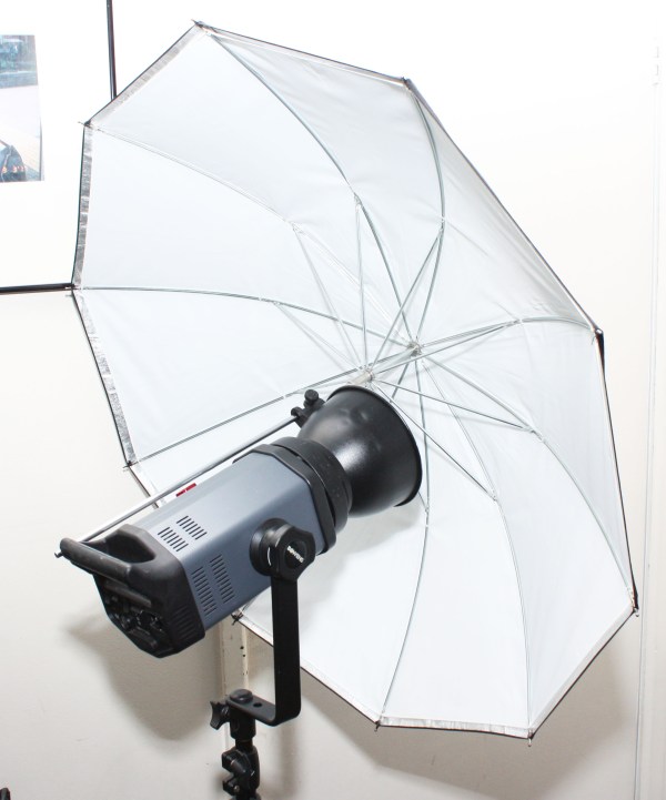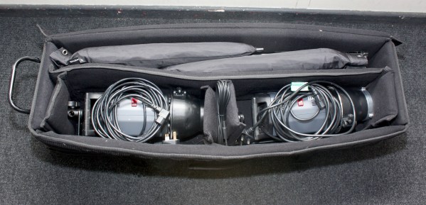 - 2x 35″ Dual white shoot-through / reflective brolly, Roller case