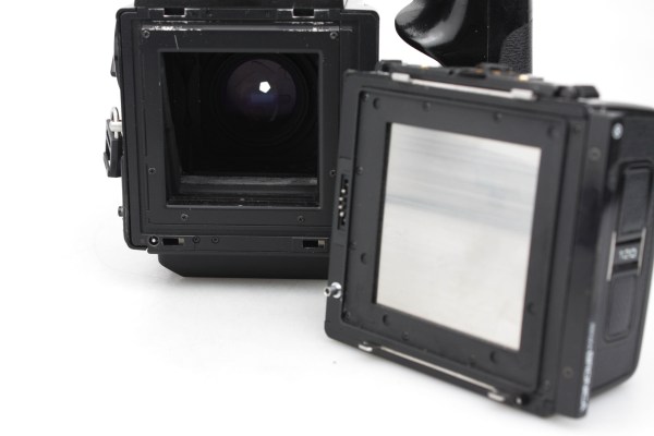 - Camera comes complete with 120 film back, darkslide and cap